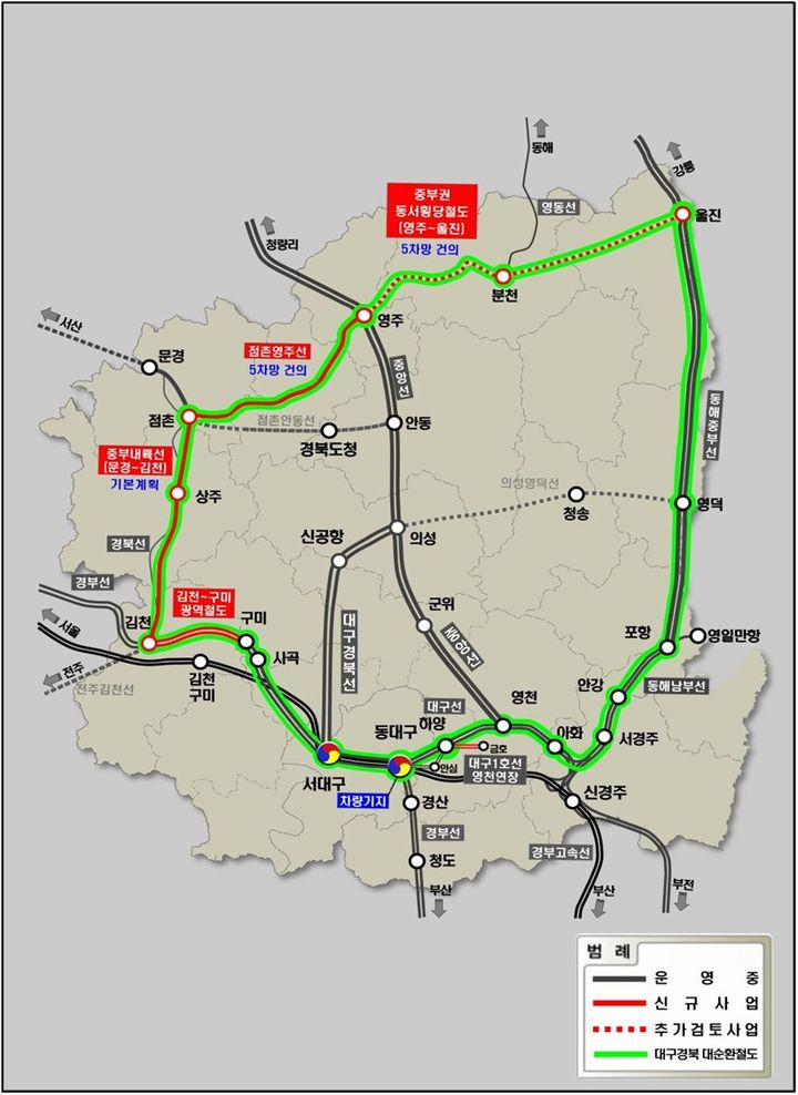 경북도는 이를 보완하기 위한 촘촘한 격자형 철도망 구축 사업으로 대구경북 대순환 철도와 대구경북신공항 순환 철도를 추진하기로 했다.