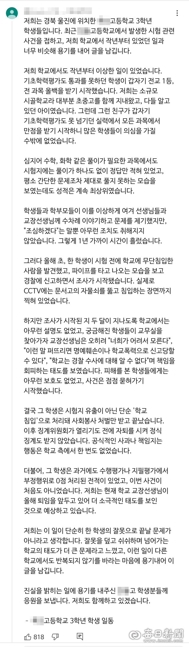 경북 울진의 한 고등학교 3학년이라고 밝힌 게시자는 해당 학교에서 1년전부터 특정학생이 수차례 시험에서 갑작스럽게 높은 점수를 받는 등 이상한 일이 반복됐고 정답과 유사한 풀이, 실험 결과와 정확히 일치하는 답안을 제출하는 경우가 확인돼 학생들 사이에 의혹이 쌓여왔다고 밝혔다.