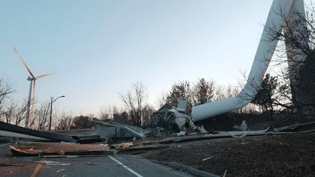 최초 신고자는 “풍력발전기 한 대가 쓰러져 도로를 가로막고 있다”며 119에 신고한 것으로 전해졌다.