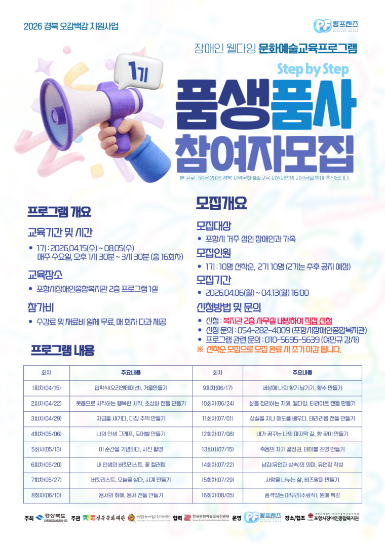 참여 대상은 포항시에 거주하는 성인 장애인 및 그 가족이며, 1기 모집 인원은 총 10명으로 선착순 마감된다. 모집 기간은 4월 6일부터 4월 13일 오후 4시까지다.