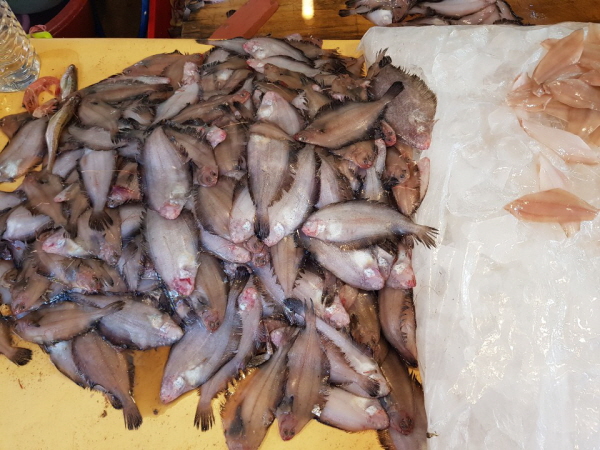 ▲ 시장 좌판에 깔린 미주구리 횟감