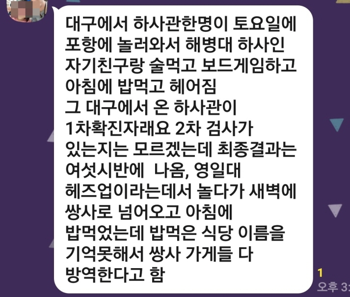 【KNC 뉴스】김명남 기자=「영일대에서 놀다가 새벽에 쌍사로 넘어오고 아침에 밥 먹었는데 밥 먹은 식당은 이름을 기억 못해서 쌍사 가게들 다 방역한다고 함...쌍사 새마을금고도 폐쇄했습니다.」