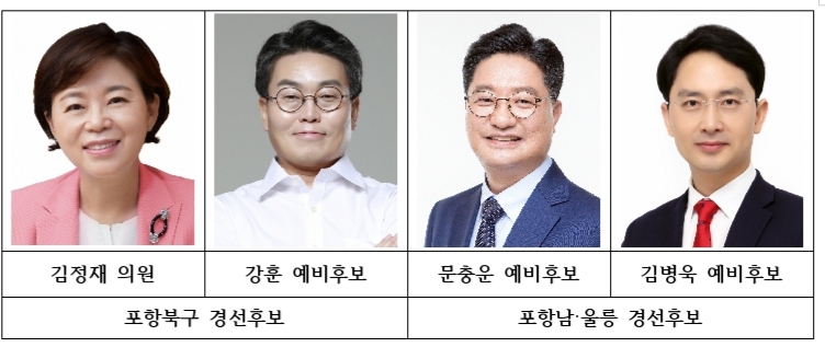 미래통합당 포항지역 총선 최종 경선대진표는 포항북구의 경우 현역의원인 김정재의원과 신예인 강훈 예비후보, 남구는 신예인 문충운·김병욱 예비후보 2명이 경선주자로 최종 결정됐다.