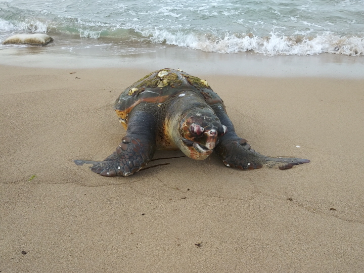 포항해경에 따르면 지난 4일 오후 4시54분께 포항시 북구 흥해읍 용한리 바닷가에서 길이 1m 15cm, 둘레 1m 50cm 크기의 붉은 바다거북 한 마리가 죽은채 백사장에서 발견됐다는 것이다.
