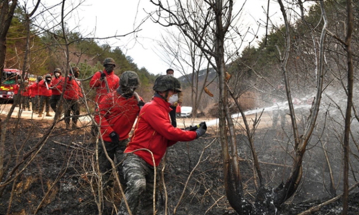 지난 4일 경북 울진 북면 두천리에서 발생한 산불이 4일째 이어지면서 해병대가 국내 최대 금강송 군락지를 보호하기 위해 사투를 벌이고 있다.