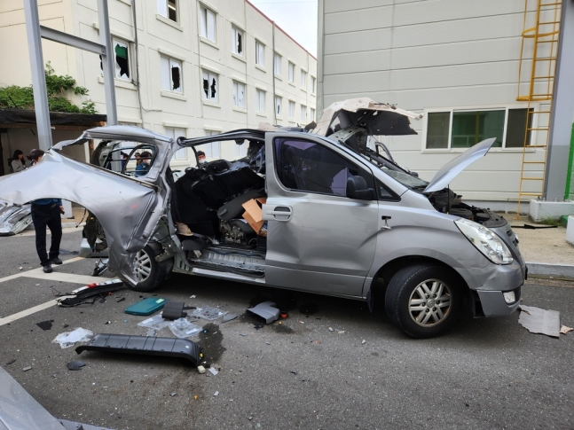 당시 승합차에는 2명이 탑승하고 있었는데 갑작스런 폭발로 이들 탑승자는 물론 근처에 있던 공장관계자 3명 등 모두 5명이 차량파편 등으로 다쳐 병원으로 후송됐다.