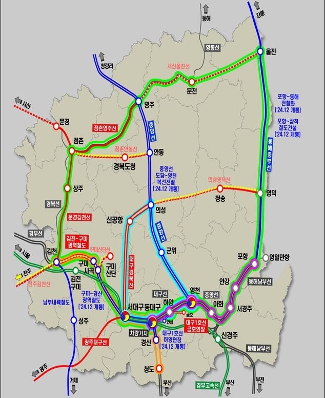 지방자치단체 주도 광역철도 사업인 대구권 광역전철(구미∼경산), 대구 1호선 하양 연장 구간도 올해 말 개통된다.