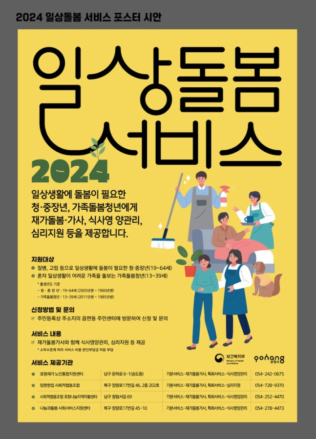 포항시가 돌봄이 필요한 청·중장년과 가족돌봄청년의 일상생활을 지원하기 위해 올해 일상돌봄서비스사업의 신규 대상자를 모집한다고 밝혔다.