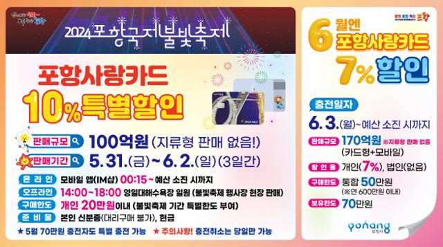 포항시는 31일부터 6월 2일까지 열리는 포항국제불빛축제 기간 포항사랑카드와 모바일 포항사랑상품권 100억 원어치를 10% 할인 판매한다고 밝혔다.