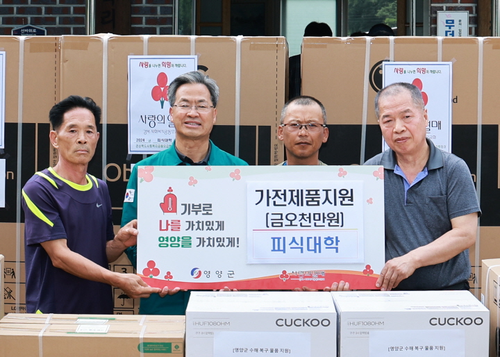 피식대학측은 피해 가정에서 시급하게 필요한 냉장고와 23대와 세탁기 5대, 선풍기 25대, 밥솥 25대, TV 3등 등 필수가전을 기부하며 하룻밤에 삶의 터전을 잃어 낙담하고 있을 영양군민들에게 온정을 전했다.