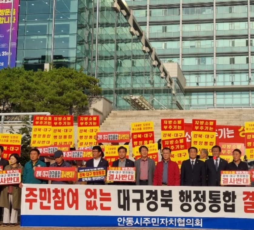 안동시와 예천군의회 의원 및 자생단체회원들은 포항시청광장에서 "경북도민의 동의 없는 대구·경북 행정 통합은 있을수 없다"면서 "행정통합을 즉각 중단해야 한다"고 밝혔다.