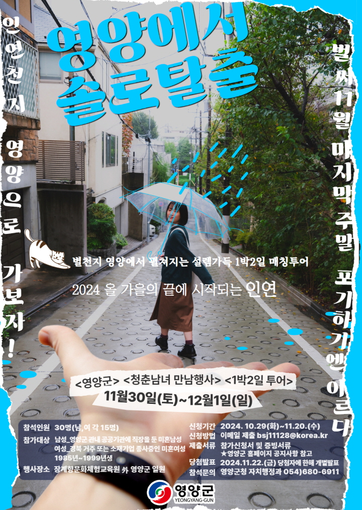 영양군이 미혼청춘남녀들의 만남을 주선하는 ‘영양에서 솔로탈출’을 기획하고 있어 벌써부터 뜨거운 반응을 보이고 있다.