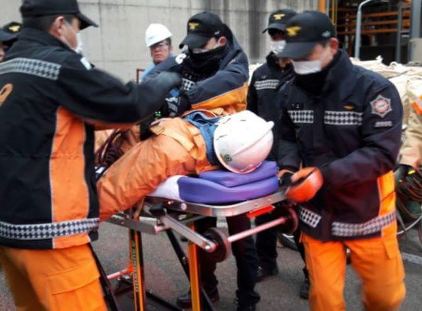 ▲ 다친 근로자를 소방관들이 급히 후송하고 있다