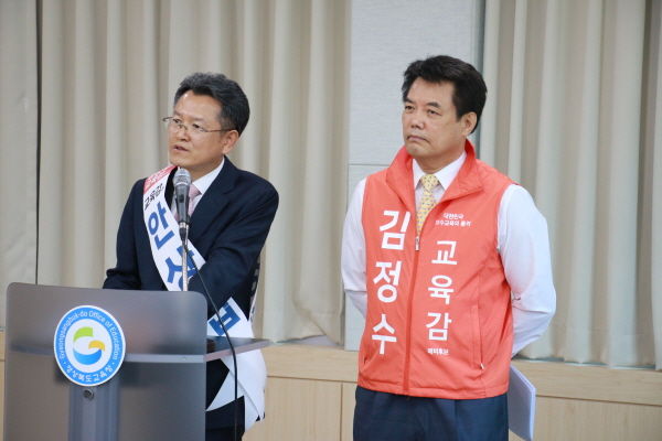 경북교육감 예비후보인 안상섭, 김정수 후보는 26일 기자회견을 열고 “그동안의 보수후보 단일화는 추진과정에서의 절차적 문제점은 물론 공정성과 신뢰성을 잃어버린 잘못된 방식”이라고 지적하고 “단일화 과정을 주도해온 교추본을 배제한 보수후보 4명의 직접적 단일화를 추진할 예정”이라고 밝혔다.