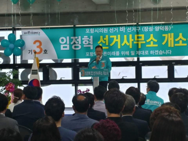 【포항/경북뉴스통신】김명남 기자=중도 개혁보수를 표방하며 출범한 바른미래당 포항시의원 후보로 포항시 ‘바’선거구(장량동)에 출마한 임정혁 예비후보가 13일 선거사무소 개소식을 열고 본격, 세몰이에 나섰다.