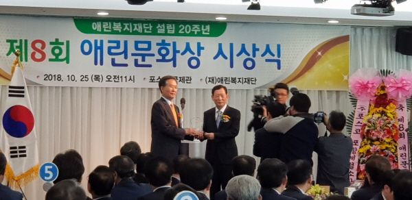 애린복지재단(이사장. 이대공)은 지난 25일 포스코국제관에서 제8회 애린문화상 시상식을 갖고 김일광작가에게 애린문화상을 수여했다.